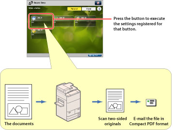 For example, you can scan two-sided originals and e-mail the file to the recipient in the Compact PDF format by pressing a single button.