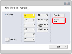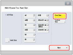 → enter the correct values.To select a registered paper size stored in a size button ([S1] to [S5]), you must store the irregular paper size in the size button beforehand. For instructions on storing irregular paper sizes, see "Registering/Editing/Deleting Custom Paper Sizes."