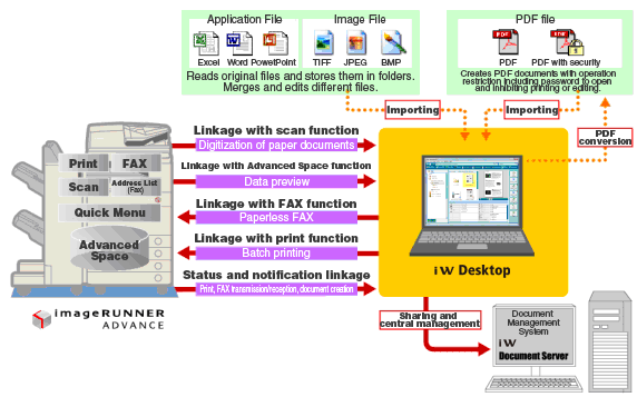 iW Desktop is an application which makes imageRUNNER ADVANCE easier to use as well as improves productivity and reduces costs concerning paper and electronic documents in your office.