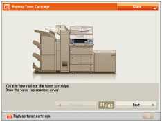 When the message <Replace toner cartridge.> is displayed on the touch panel display, press  on the bottom right and replace the toner cartridge.