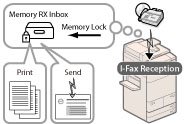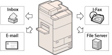You can set to automatically forward received I-fax documents that match specified forwarding conditions to any destination using the desired send settings. You can forward received I-fax documents to another machine (relay function), or store them in a Confidential Fax Inbox. You can also set automatic forwarding to activate at a specified time. Since received documents that do not match the forwarding conditions can also be forwarded to any desired destination, you can use this function to sort and deliver received I-fax documents to the appropriate destinations.