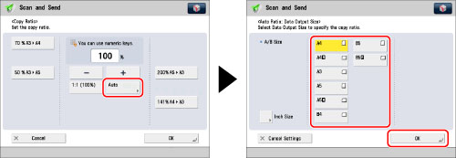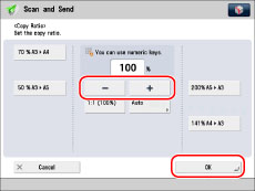 If you set PDF (Trace & Smooth), PDF (Compact), PDF (OCR), XPS (Compact), XPS (OCR), or OOXML as the file format, you can only send at a zoom ratio of [1:1 (100%)] or [Auto].