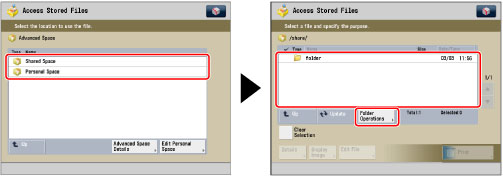 Select the desired storage space → select the desired folder level → press [Folder Operations].