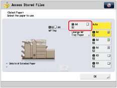 Icons indicating the type of paper loaded in each paper drawer can be displayed on paper selection screens, if you store that information into the machine beforehand. (See "Registering/Editing Custom Paper Types.")
