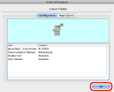 If the printer driver name displayed at the top of the [Printer Information] dialog box and the printer name displayed as [Name Retrieved from the Printer] do not correspond correctly, you may not be able to use the printer functions correctly. If the names do not correspond, delete the printer you have added in [System Preferences] and add it again. For details, see the Printer Driver Guide (see "Installation").