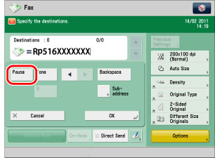 Press [Pause] after entering the outside line access number ('R' in the above example) and before entering the fax number.