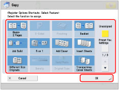 You can create shortcuts to frequently used functions in [Options]. You can also create shortcuts to [Favorite Settings]. For information on favorite settings, see "Storing, Recalling, and Deleting Favorite Settings (Favorite Settings)." These shortcuts then appear on the Basic Features screens.