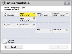 You can register paper types if paper types for the loaded paper are not displayed on the detailed setting list. For instructions on registering paper types, see "Registering/Editing Custom Paper Types."