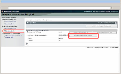 A partir du portail de l'interface utilisateur distante, cliquer sur [Réglages/Enregistrement] → [Licence/Autre] → [Enregistrer/Mettre à jour logiciel].