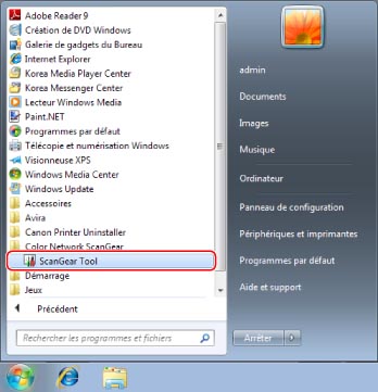 Sous Windows XP, cliquer sur [Démarrer] → [Tous les programmes] → [Color Network ScanGear] → [ScanGear Tool]. Sous Windows Vista/Windows 7, cliquer sur [