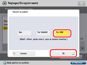 → [Réglages de fonction] → [Mémoriser/Accéder aux fichiers] → [Réglages d'espace avancé] → [Ouvert au public] → [Par SMB] → [OK].