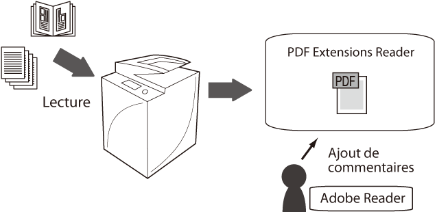 Si le mode Extensions Reader est sélectionné pour convertir un document papier en fichier PDF, il est possible d'ajouter ou de modifier des commentaires, et d'ajouter des signatures à l'aide d'Adobe Reader (Adobe Reader 7 ou version ultérieure).