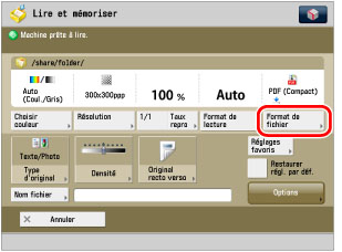 Si [Formater PDF en PDF/A] sur l'écran Réglages/Enregistrement est activé ("Oui"), il est impossible de sélectionner le format Extensions Reader.