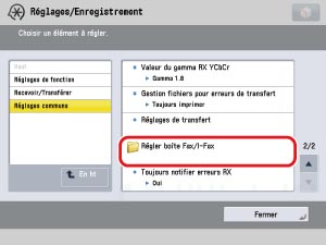 → [Réglages de fonction] → [Recevoir/Transférer] → [Réglages communs] → [Régler boîte Fax/I-Fax].