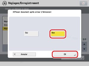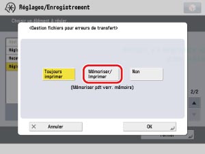 → [Réglages de fonction] → [Recevoir/Transférer] → [Réglages communs] → [Gestion fichiers pour erreurs de transfert] → sélectionner [Mémoriser/Imprimer] ou [Toujours imprimer] → appuyer sur [OK].