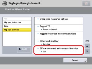 → [Réglages de fonction] → [Envoi] → [Réglages communs] → [Effacer document après erreur d'émission].