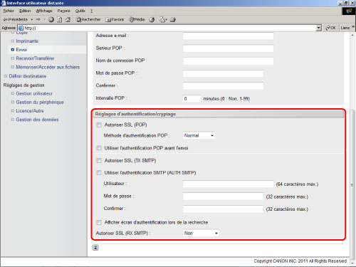 Sélectionner ce réglage afin d'utiliser SSL pour la communication POP. Sélectionner la méthode d'authentification POP sur la liste en fonction du F.A.I.