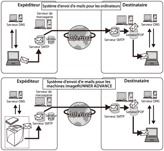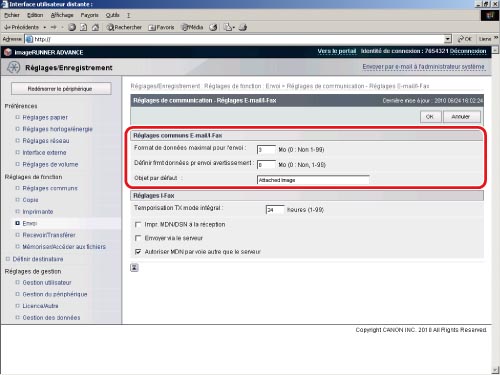 → [Réglages de fonction] → [Envoi] → [Réglages E-mail/I-Fax] → [Réglages de communication].La fonction I-fax des machines imageRUNNER ADVANCE utilise le protocole SMTP pour la transmission.