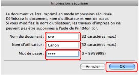 Saisir le nom du document, le nom d'utilisateur et le mot de passe dans la boîte de dialogue [Impr. sécurisée] → cliquer sur [OK].