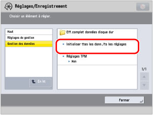→ [Réglages de gestion] → [Gestion des données] → [Initialiser ttes les donn./ts les réglages].