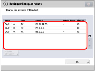 [Réglages/Enregistrement] → [Réglages réseau] pour <Préférences> → [Journal des adresses IP bloquées].