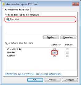 Sélectionner [Everyone] → vérifier que [Autoriser] est sélectionné pour [Modifier] → cliquer sur [OK]. Si l'option [Autoriser] n'est pas sélectionnée, sélectionner [Autoriser] → cliquer sur [OK].