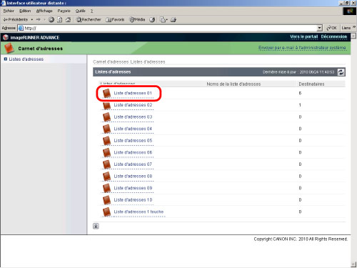 Cliquer sur [Carnet d'adresses] → [Liste d'adresses 01] dans l'écran Liste d'adresses.