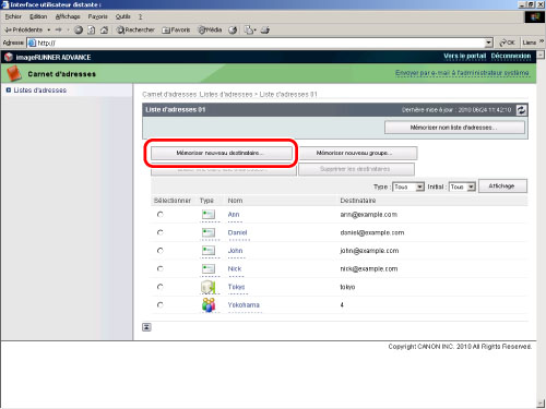 Une adresse e-mail peut être enregistrée efficacement de l'interface utilisateur distante.