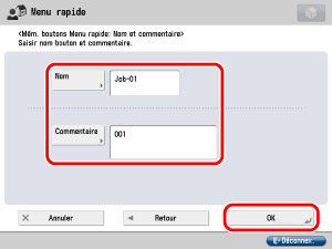 Si [Affichage confirmation réglages Favoris] est défini sur "Non" lors de la mémorisation dans le menu rapide, la boîte de dialogue de confirmation ne s'affiche pas avant le traitement des réglages mémorisés dans le bouton.
