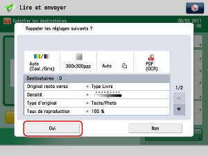 Pour plus d'informations sur la boîte de dialogue de confirmation des réglages, voir "Envoi d'un document avec le menu rapide".