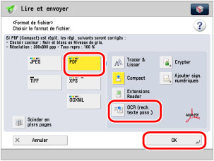 Sélectionner [PDF] → [OCR (rech. texte poss.)] → appuyer sur [OK].