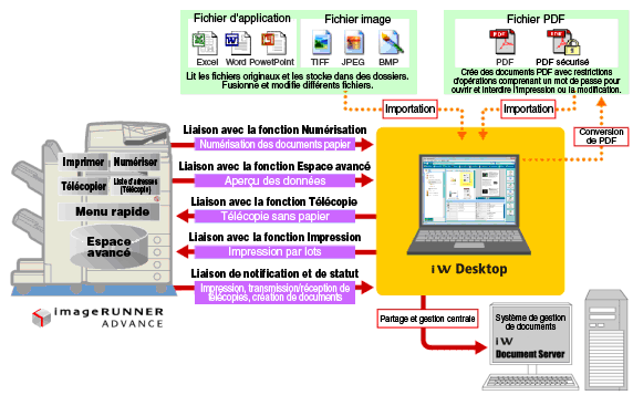 L'iW Desktop est une application qui simplifie l'utilisation d'imageRUNNER ADVANCE et qui permet d'améliorer la productivité et de réduire les coûts des activités de production de documents papier et électroniques de votre entreprise.
