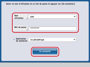 Saisir un [Nom d'utilisateur] et un [Mot de passe] dans l'écran de connexion d'une machine équipée d'iW Function Flow → appuyer sur [Connexion]