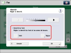 Si la densité de fond est réglée en appuyant sur [Régler] for <Densité du fond>, le réglage [Auto] est annulé. De même, si l'on appuie sur [Auto] pendant la configuration manuelle sous [Régler], les réglages sont annulés. La machine règle automatiquement la densité en fonction du fond.