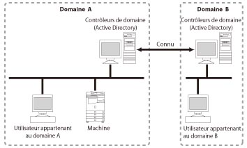 Les utilisateurs appartenant au Domaine A (comprenant la machine) et ceux du Domaine B (reconnu bidirectionnellement par le Domaine A) sont authentifiables, de même que ceux mémorisés directement dans la machine. L'utilisateur sélectionne l'emplacement de connexion (nom de domaine ou [Ce périphérique]) lors de sa connexion.