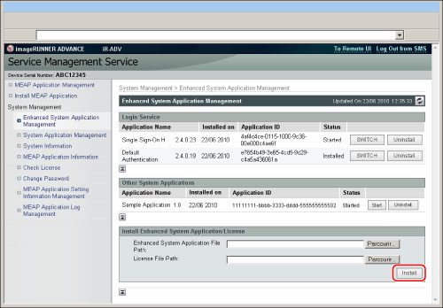 Lors de l'installation d'une application système, il faut spécifier le fichier d'application et le fichier de licence.