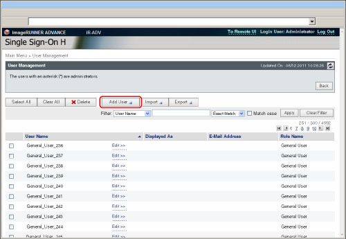 Un astérisque (*) sur la droite désigne l'administrateur système (User Management) enregistré sur la page [Administrator].