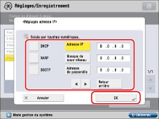 Appuyer sur [Réglages adresse IP] pour [Réglages IPv4] → effectuer les réglages suivants → appuyer sur [OK].