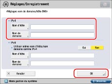 Appuyer sur [Réglages nom de domaine/hôte DNS] pour [Réglages DNS] → effectuer les réglages suivants dans <IPv4> → appuyer sur [OK].