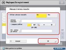Si [Adresse manuelle] demeure vide, il est impossible d'utiliser une adresse manuelle. De plus, aucune des adresses suivantes ne peut être définie pour [Adresse manuelle] :
