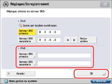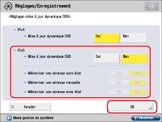 Si l'option <Utiliser DHCPv6> a été définie sur "Oui" à l'étape 7, le nom de domaine spécifié manuellement sera écrasé. Même si <Utiliser même nom d'hôte/nom de domaine que IPv4> est réglé sur "Oui", le nom de domaine obtenu du serveur DHCPv6 est utilisé.