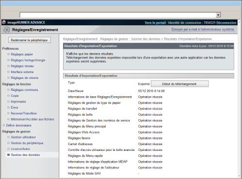 Il est également possible de vérifier les derniers résultats d'importation/exportation en appuyant sur [Gestion des données] sous <Réglages de gestion> → [Résultats d'Importation/Exportation].