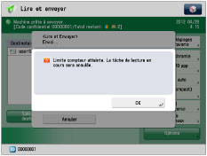 La machine s'interrompt si la Limite de lecture est atteinte pendant le traitement des originaux provenant du chargeur. (Les originaux lus avant que cette limite ne soit atteinte ne s'ajoutent pas au total de lecture.)