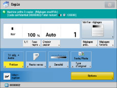 Dans l'écran des fonctions de base du mode Copie et dans l'écran Réglages impression, les deux éléments ayant le Total restant le moins élevé s'affichent. Cependant, si la Limite total impression est la moins élevée, c'est uniquement elle qui s'affiche.