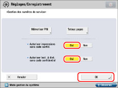 Les paramètres <Autoriser impressions sans code confid.> et <Autoriser lect. à dist. sans code confidentiel> ne sont activés que si la machine propose les fonctions d'impression et de lecture à distance.