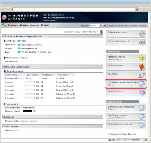 Pour utiliser [Contrôle d'accès utilisateur Espace avancé], définir [Utiliser HTTP] dans [Préférences] (Réglages/Enregistrement) sur "Oui". (Voir "Réglages communs à TCP/IPv4 et TCP/IPv6".)