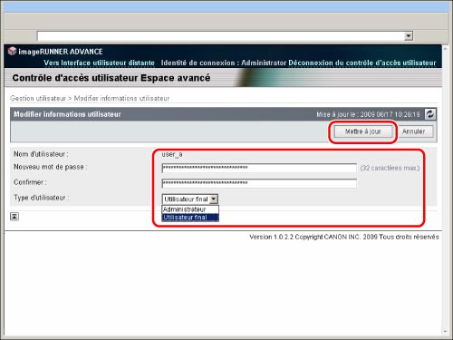 Seul l'administrateur de l'espace avancé peut modifier le type d'utilisateur. Cependant, le type d'un utilisateur connecté ne peut pas être modifié.