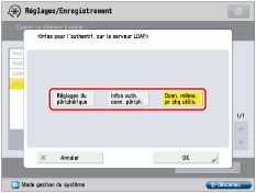 Utilise les informations d'authentification définies sous [Mémoriser serveur LDAP]. (Voir "Mémorisation d'un serveur LDAP".) D'autres réglages ne sont pas requis pour chaque utilisateur.