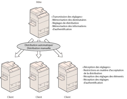 Les informations de périphérique peuvent être partagées entre les machines du même modèle (imageRUNNER ADVANCE 6275i/6265i/6255i). Cependant, certaines informations risquent de ne pas être distribuées correctement selon les produits en option disponibles sur la machine.