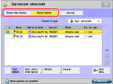 Appuyer sur [Impression avec priorité] pour imprimer en priorité la tâche sélectionnée une fois la tâche en cours terminée. |